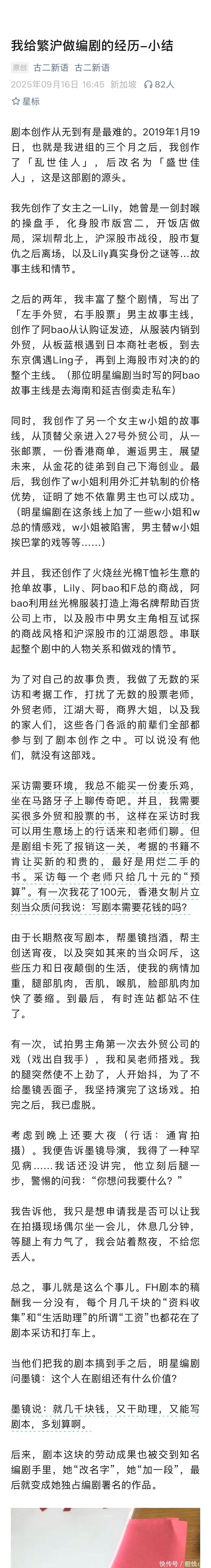 古二在剧组身兼多职:核心创作:负责《繁花》主线剧情(如商战脉络“宝延风波”、角色设定“派头、噱头、花头”);杂务工作:承担准备宵夜、清理片场等工作,月薪仅3000-6000元;健康恶化:身患渐冻症(肯尼迪病),病情因高压工作加重,却遭剧组人员嘲笑。